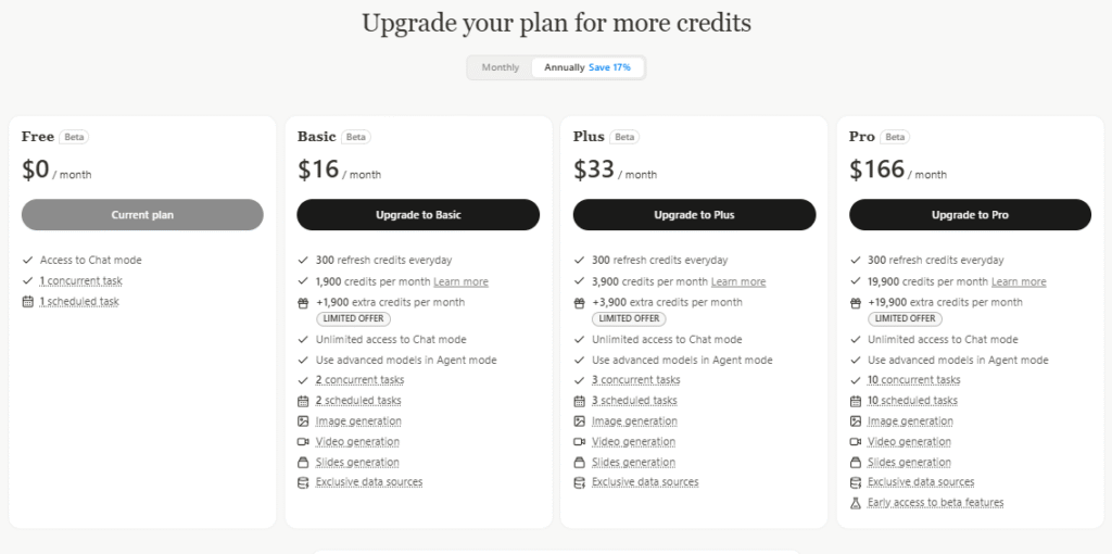 | Pro Plan | $166/monthly | 19,900 extra credits every day, 10 concurrent tasks, and access to all AI modes. |